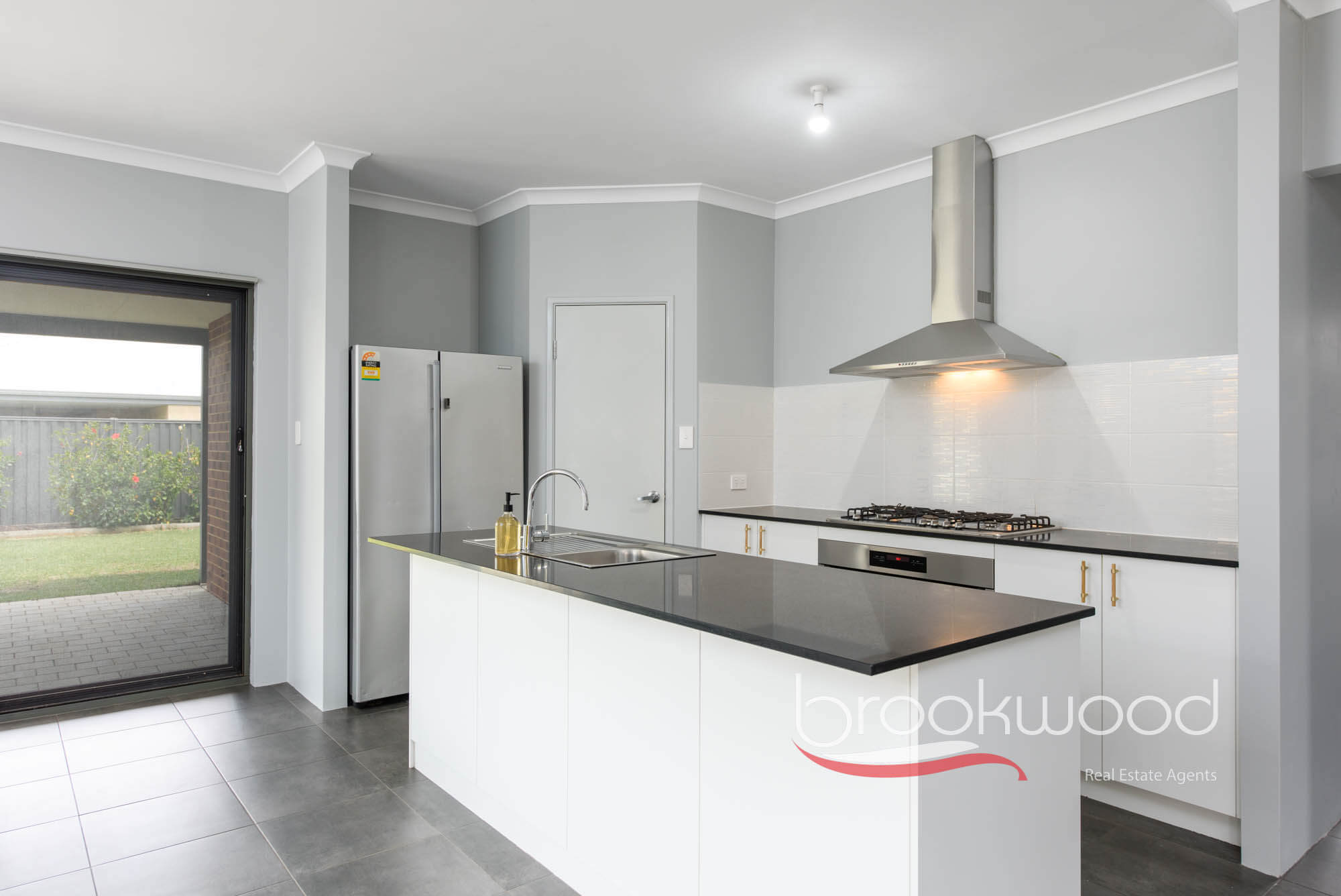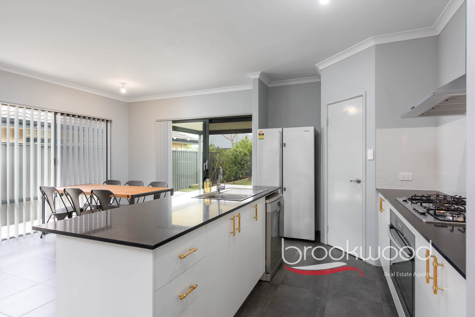 The kitchen is a focal point, anchored by a sleek island bench topped with Caesarstone and featuring an integrated breakfast bar. A corner pantry and under-bench cabinetry surround the 900mm oven, 5-burner gas hob and dishwasher, offering ample storage without sacrificing the streamlined aesthetic.