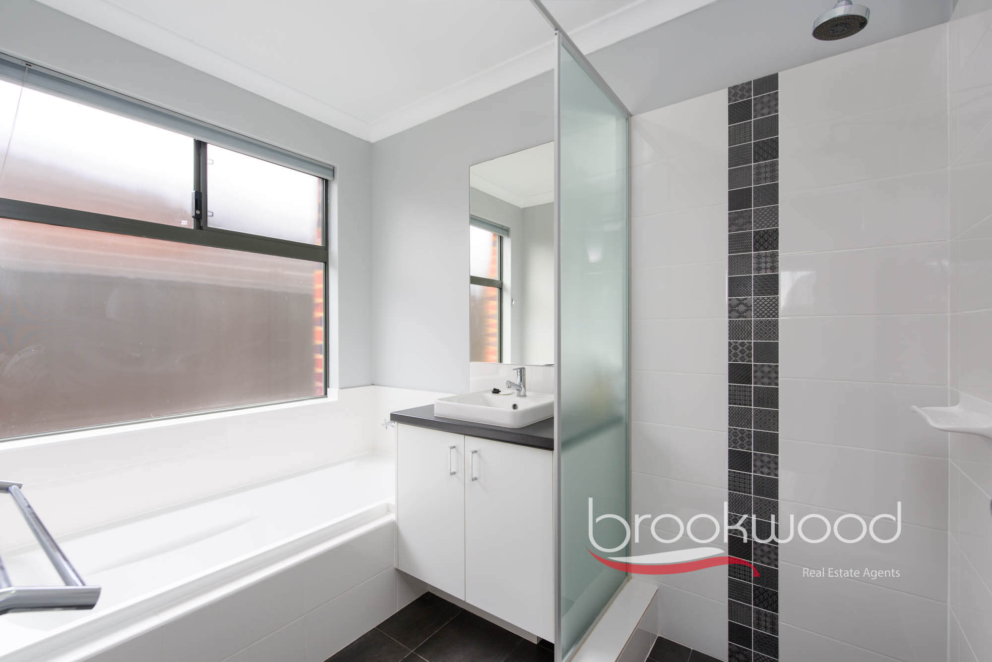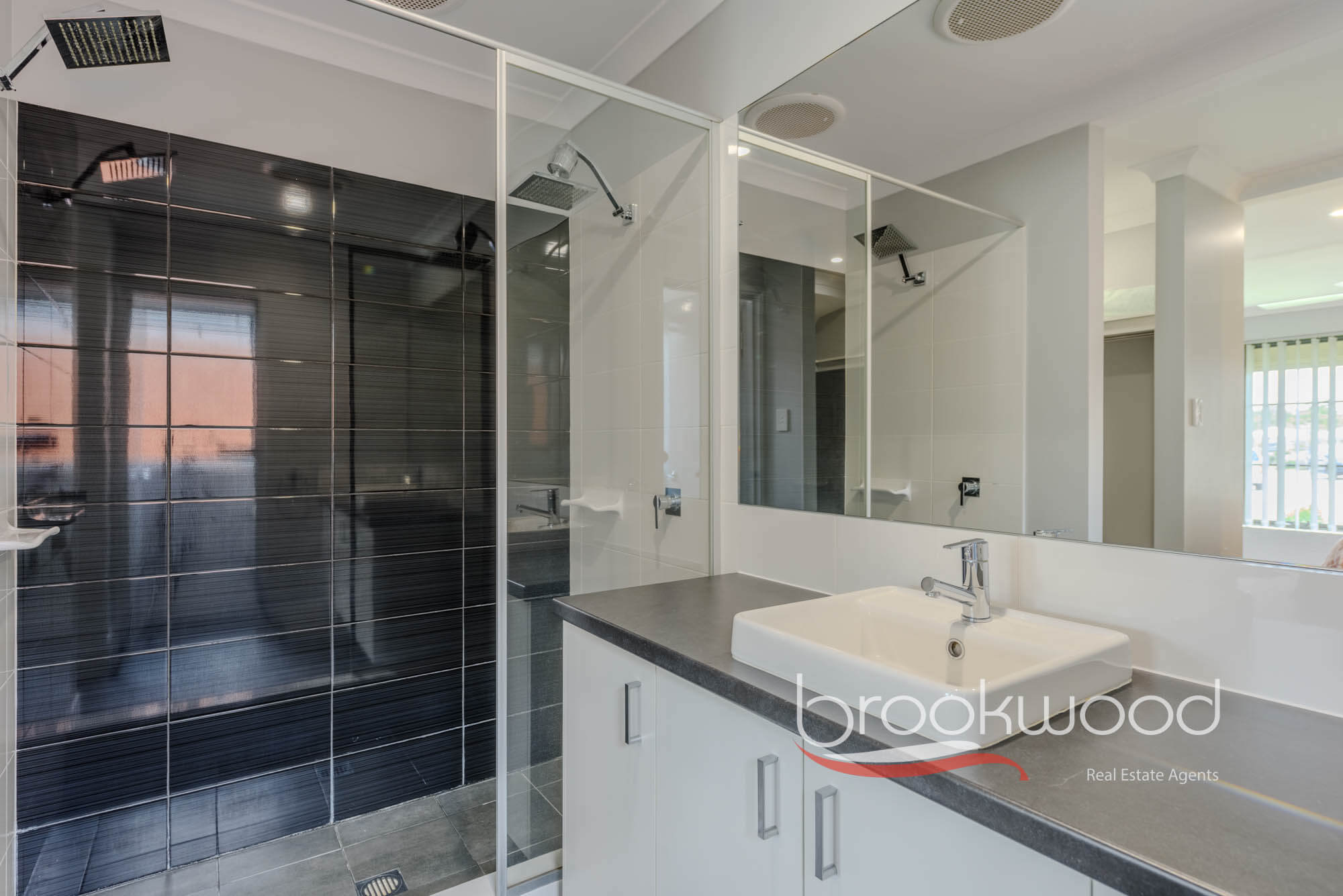 The front door reveals a central hall leading to a spacious principal suite to one side. Two north-facing windows invite ample natural light into this tranquil parents’ retreat. The suite features a walk-through robe leading to a sleek ensuite, complete with a walk-in shower, central vanity and a separate WC. Subtle luxury is reflected in the modern, neutral palette of soft grey, charcoal and crisp white, offering an adaptable backdrop for any style. A ceiling fan adds to the sense of ease in this peaceful, private space – perfect for relaxation and retreat.